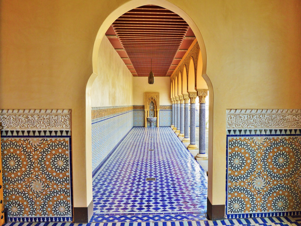 The word « azulejo » comes from the Arabic « al-zillīj » (الزليج), meaning « polished stone ». These glazed ceramic tiles originated in North Africa and the Middle East, where Islamic artisans used them to decorate palaces, mosques, and fountains. Their intricate geometric patterns were inspired by Islamic art, which avoided depicting human figures.
